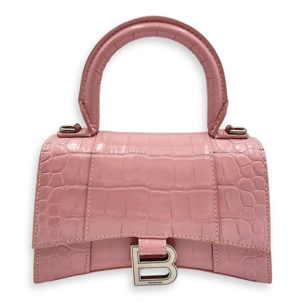 Hourglass Pink Crossbody Bag in Crocodile Embossed Leather, Silver hardware