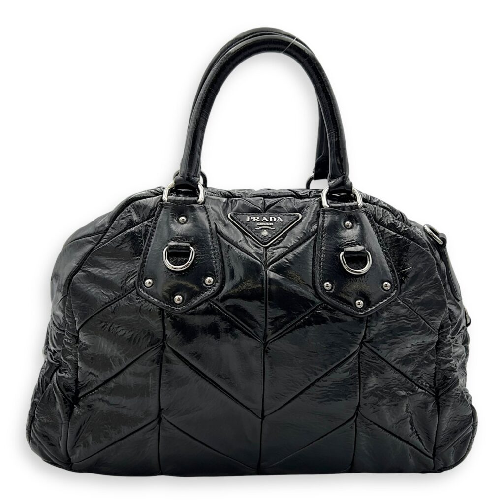 Quilted Top Handle Bag Black in Glazed Calfskin, Silver hardware