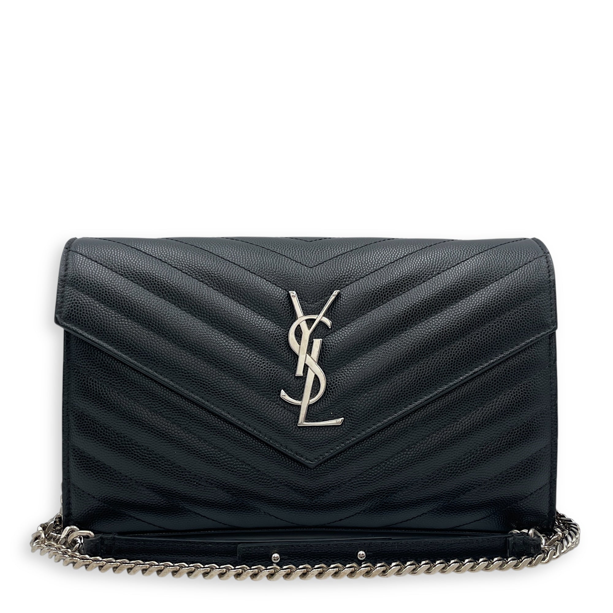 Cassandra Black Wallet on Chain in Calfskin, Silver hardware