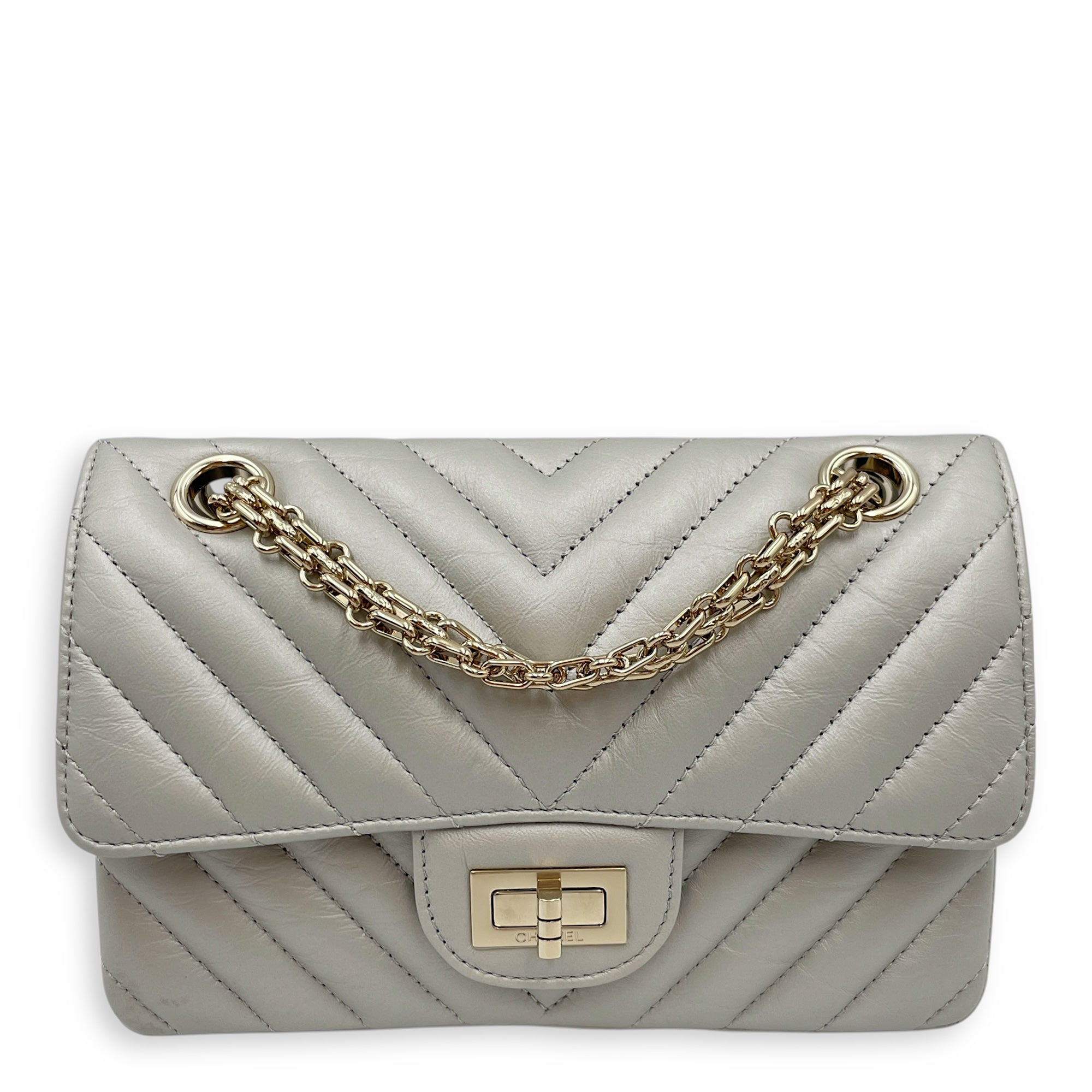 Chevron 22.55 Reissue Mini Metallic Grey Crossbody Bag in Lambskin, Gold hardware
